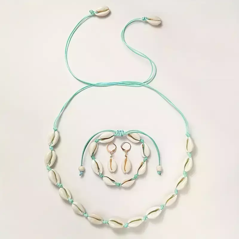 Conjunto de Joias Boho-Chic: Colar, Pulseira e Brincos Ajustáveis de Concha Natural & Corda Colorida - Perfeito para Uso Diário ou Férias
